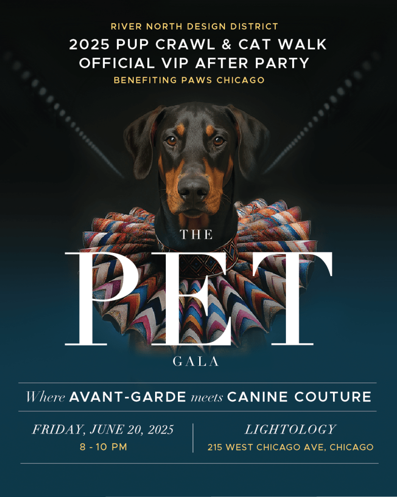 The event concludes at the Official After Party hosted by Lightology, 215 W. Chicago Ave., doors open at 8:00 p.m. This year’s after party theme is a spin-off of the MET Gala–The PET Gala! From the Pup Crawl & Cat Walk to the high fashion atelier, step into a world of exhibition and style in which celebrated artists and fashion designers in the city interpret the avant-garde as bold creations for couture-clad canines. With all the magic and theater known dans la mode, this stylish after party soiree is dedicated to the four-legged companion following the social benefit that toasts to good design and a good cause. Experience the fashion show amid the glitz and glam, where community, cocktails, and couture come together under the lights at one of River North Design District’s award-winning showrooms.