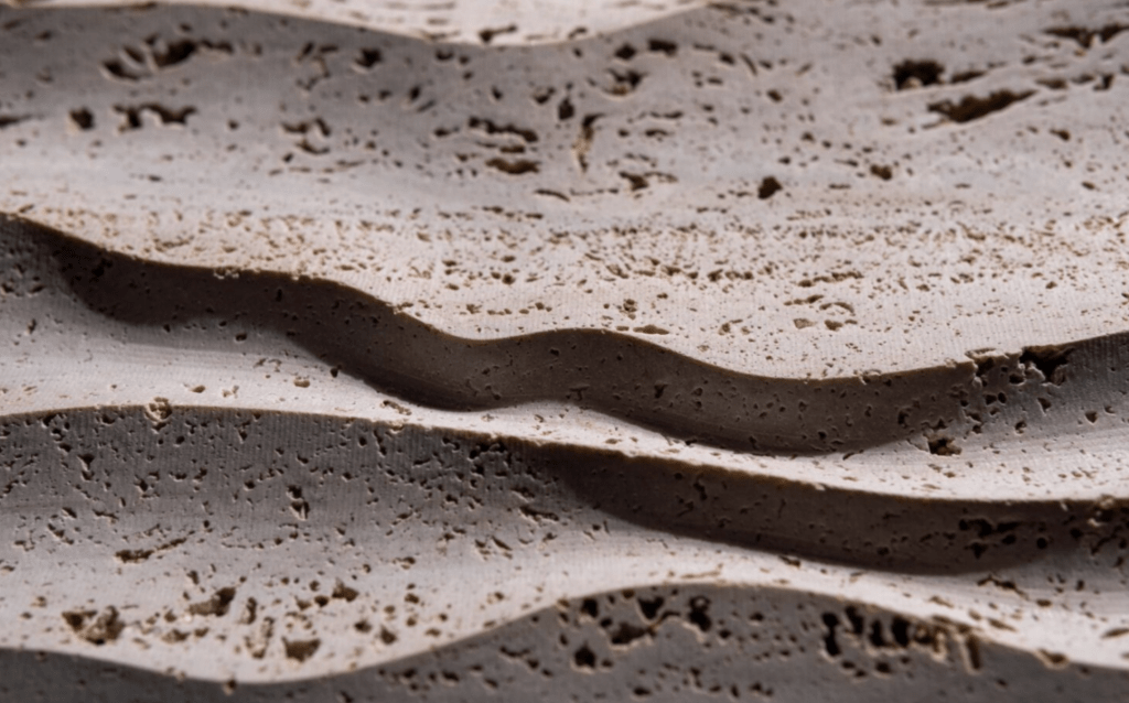 Left: A Concave Flute in Cecilia Gold Limestone from the Architectonic series Right: Weave in Travertine Beige with gold leaf from the Aurum series, locally offered by Precision Stone Designs.