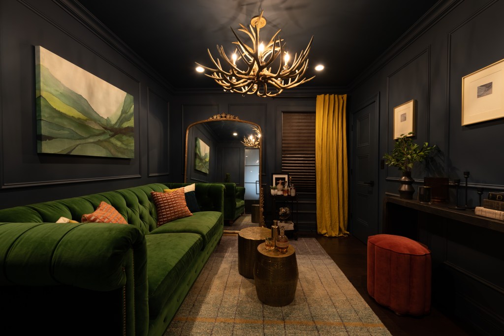 When it comes to selecting a rug, Metro Design Build starts with function, then lets style lead the way. In a rich, dark-paneled lounge, a soft, neutral-toned rug adds comfort without distracting from a statement green velvet sofa and antler chandelier. In contrast, the dining room calls for practicality—low-pile rugs that can handle the occasional spill while still elevating the space with bold, black-and-white geometry.